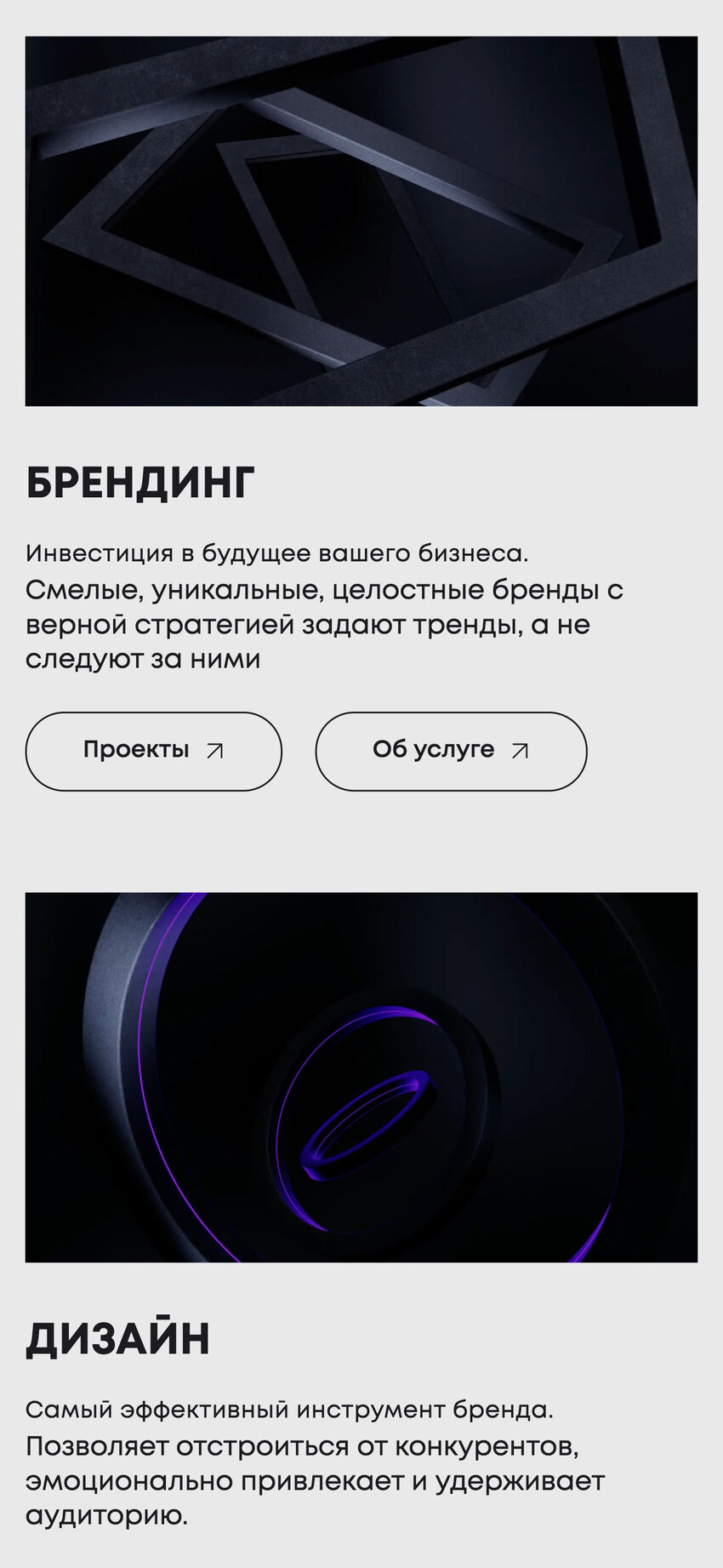 Секция «Услуги»: презентация трёх направлений (Брендинг, Дизайн, Среда) с возможностью перехода к кейсам и изучения деталей.
